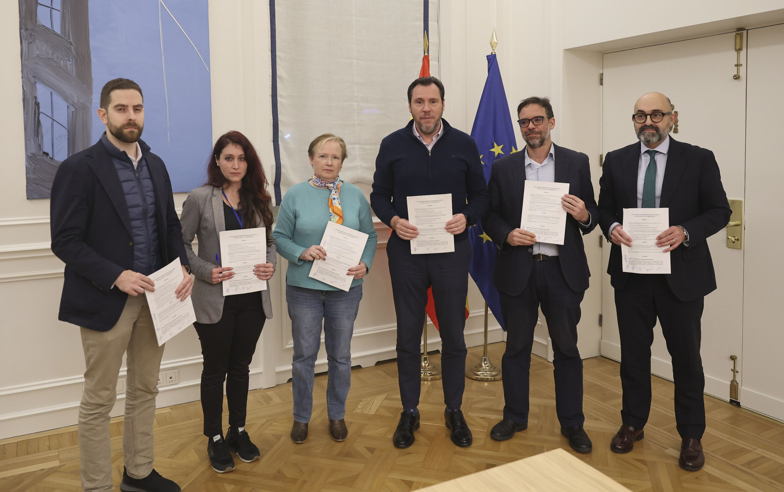 El ministre de Transports, Óscar Puente, va signar ahir juntament amb CCOO, UGT i el sindicat de maquinistes, Semaf, l’acord per desconvocar la vaga del ferrocarril que compta amb una sèrie de millores en la seguretat de la xarxa viària i les condicions dels treballadors del sector.
