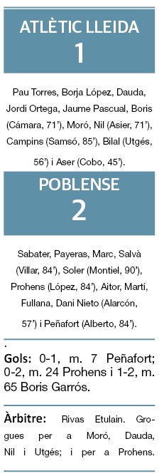 El canvi d’escenari no es va traduir en un triomf de l’Atlètic Lleida. L’equip lleidatà, a més, va veure com el Poblense sumava el triomf, allunyant-lo d’una salvació que ja sona a somni. El play-out queda a set punts i la permanència, a vuit, donats els resultats.