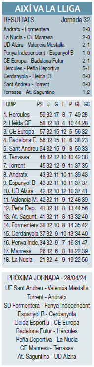 “Veníem a pels tres punts, era molt important sumar un triomf avui per continuar liderant la classificació i que ens hagués donat un cert coixí. Ara mateix encara depèn de nosaltres perquè juguem a casa amb l’Europa i acabem a Hèrcules, però sabíem que seria un partit molt difícil. És una pena no haver pogut enganxar una jugada. L’equip ha competit bé i ha estat defensivament molt bé. En la segona part hem fet passos cap endavant, però són camps molt difícils perquè costa enganxar jugades, costa treure rendiment del que hi havia al camp, però ha sigut dels partits més competits, i és una pena no marcar en la doble ocasió final en el temps afegit. Queden dos partits, continua depenent de nosaltres en dos bons escenaris. A casa donem un nivell molt bo i jugarem a Alacant, pas a pas. Primer l’Europa que és el que fem sempre, centrarnos en el rival de cada setmana. El punt no és el que volíem, però està tot tan ajustat que s’han de veure totes les possibilitats que es presenten amb aquest punt”, afirmava el tècnic del Lleida, Ángel Viadero, en el postpartit a Les Fontentes.