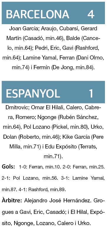 Així, als deu minuts, Ferran Torres rematava de cap en el segon pal un córner sacat per Lamine Yamal per a fer el 1-0 i, un quart d’hora després, els mateixos protagonistes fabricaven el segon. Aquesta vegada, Lamine habilitava amb l’exterior al davanter blaugrana que, sobre la sortida de Dmitrovic, creuava de primeres amb un toc subtil. Un doblet que servia al punta valencià per a assolir les 18 dianes i posar fi una ratxa de catorze partits sense veure porta. En la segona part va sortir Roberto Fernández per l’Espanyol i l’equip de Manolo González va millorar. Pol Lozano feia l’1-2, però el Barça va sentenciar amb gols de Lamine i Rashford.