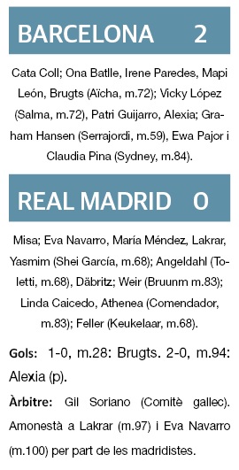 El Barcelona va conquistar la seva sisena Supercopa d’Espanya en un clàssic igualat davant el Real Madrid, que, després del gol d’Esmee Brugts en el minut 28, va estar sostingut per la seva portera Missa Rodríguez per a mantenir viva la final fins al minut 94, quan Alèxia Putellas va sentenciar des del punt de penal.