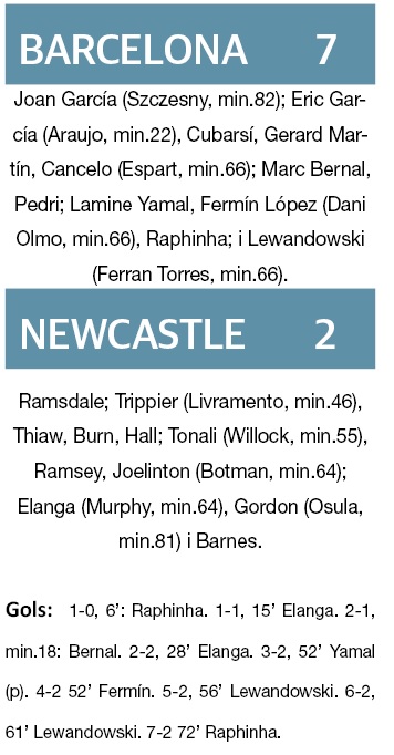 Una segona part de somni, en la qual el Barça es va divertir com poques vegades, va permetre als de Hansi Flick classificar-se per a quarts de final després de fulminar al Newcastle (7-2). Els blaugranes van passar de tenir dubtes durant molts minuts del primer temps a fulminar a l’equip anglès. Evidentment l’intervencionisme del tècnic alemany es va deixar veure, perquè el seu equip es va recompondre en l’inici de la segona part i no va donar ni una opció.