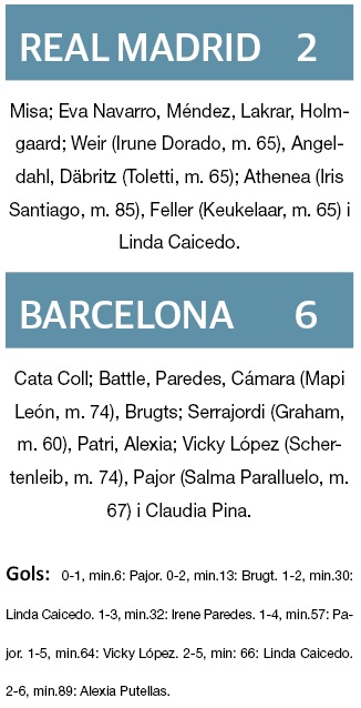 El Clàssic va començar de la millor manera per les visitants, que al minut 13 ja havien aconseguit situar el 0-2 al marcador amb els gols de Pajor i Esmee Brugts. Tot i les múltiples ocasions d’ampliar el resultat, van ser les locals que, mitjançant Linda Caicedo, van retallar distàncies a la mitja hora de joc. El Barça no va donar opció a la remuntada local perquè 2 minuts més tard Irene Paredes va situar l’1-3 al marcador a la sortida d’un córner.
