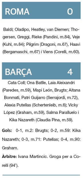 Per un moment, el Barcelona li va veure les orelles al llop. A la ‘Lloba’, concretament. Perquè després de posar-se per davant en el minut dos, pràcticament en la primera jugada del partit amb el gol de Brugts, va perdre l’ullal que acostuma a exhibir, almenys fins al minut 58, quan va fer el segon. Domini aclaparador. Possessió contínua. Enfonsament total el del Roma. Serveis de cantonada seguits i golejada final. L’entrenador, Pere Romeu, va valorar que “hem anat de menys a més”.