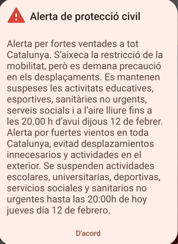 El Govern ha anunciat que aixeca la petició d’evitar els desplaçaments que no siguin necessaris pel temporal de vent de les últimes hores però demana encara molta precaució en la mobilitat, ja que aquest dijous a la tarda encara es poden registrar fortes ratxes. Així ho ha explicat la consellera d’Interior, Núria Parlon, que ha informat que enviaran un ES-Alert a la població amb l’actualització d’aquestes recomanacions. La resta de restriccions es mantenen fins a les 20 hores.