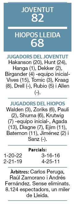 Tres quarts i escaig. Aquest és el temps que el Hiopos Lleida va tenir a tocar una nova gesta a l’Olímpic en el derbi català, però un darrer tram contundent dels locals va condemnar l’equip lleidatà a la segona derrota en la lliga. Els 24 punts de Hunt i 20 més de Hakanson van resultar una llosa insuperable.