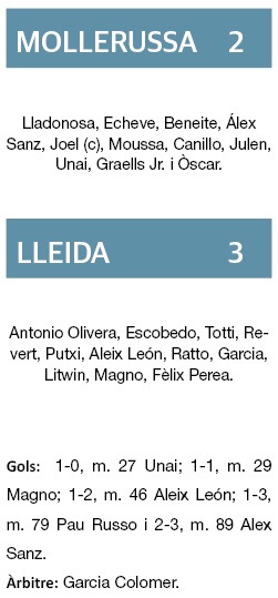En la següent gran ocasió favorable al Mollerussa, aprofitant una errada en la sortida de pilota del Lleida, va significar l’1-0, transformat amb sang freda per Unai Jodar en rebre una passada de la mort a dins de l’àrea.