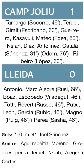 Un cop més, el Lleida va pagar car no haver-se avançat en el marcador. En el minut 41 Joel Sánchez, un dels jugadors més perillosos de l’equip local, avançava l’NSA. Amb l’1-0 es va arribar al descans.