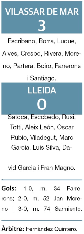 Mal resultat del Lleida per a tancar la primera volta. L’equip lleidatà va encaixar la segona derrota consecutiva a fora de casa, contra el Vilassar de Mar, que actua d’Espanyol C. El Lleida va mantenir l’encontre igualat els primers minuts, però ja abans del primer gol el Vilassar va gaudir de dos arribades. A la sortida d’un córner Farrerons es va avançar i va anotar l’1-0. Amb aquest resultat es va arribar al descans.