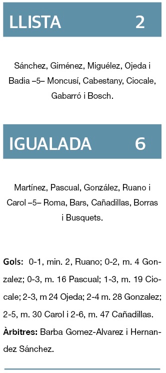 El jugador de l’Igualada Roger Bars va veure targeta blava, però el conjunt igualadí va ampliar el seu avantatge en el marcador en el minut 16 gràcies a un gol de Matías Pascual. El Llista va retallar distàncies en el minut 19 amb un gol anotat per Ciocale (1-3). Aleix Borràs va veure una altra targeta blava per l’Igualada abans del descans. En el minut 24 Nico Ojeda va marcar el 2-3. La segona part va començar amb el 2-4 marcat per Marc González. El 2-5 el va marcar en el minut 30 Marc Carol. El 2-6 final, marcat per Cañadillas, va arribar en el minut 47. El Llista s’haurà de refer per a rebre l’Alcoi diumenge.
