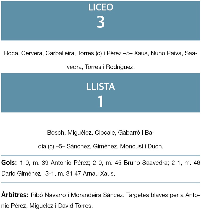 L’equip llistat va afrontar el partit empobrit per les baixes. El seu pitxitxi, Nico Ojeda, no va viatjar per un procés gripal. Sebas Moncusí sí que va formar part de l’expedició, però estava tocat. Sergi Duch, després de dos mesos de lesió, va tornar a una convocatòria, però no va jugar. Després d’una primera part sense gols, el Liceo va trencar la resistència llistada al minut 39 amb un gol de Toni Pérez. Saavedra va ampliar la distància en el minut 45. Darío va retallar distància, però Xaus va sentenciar.