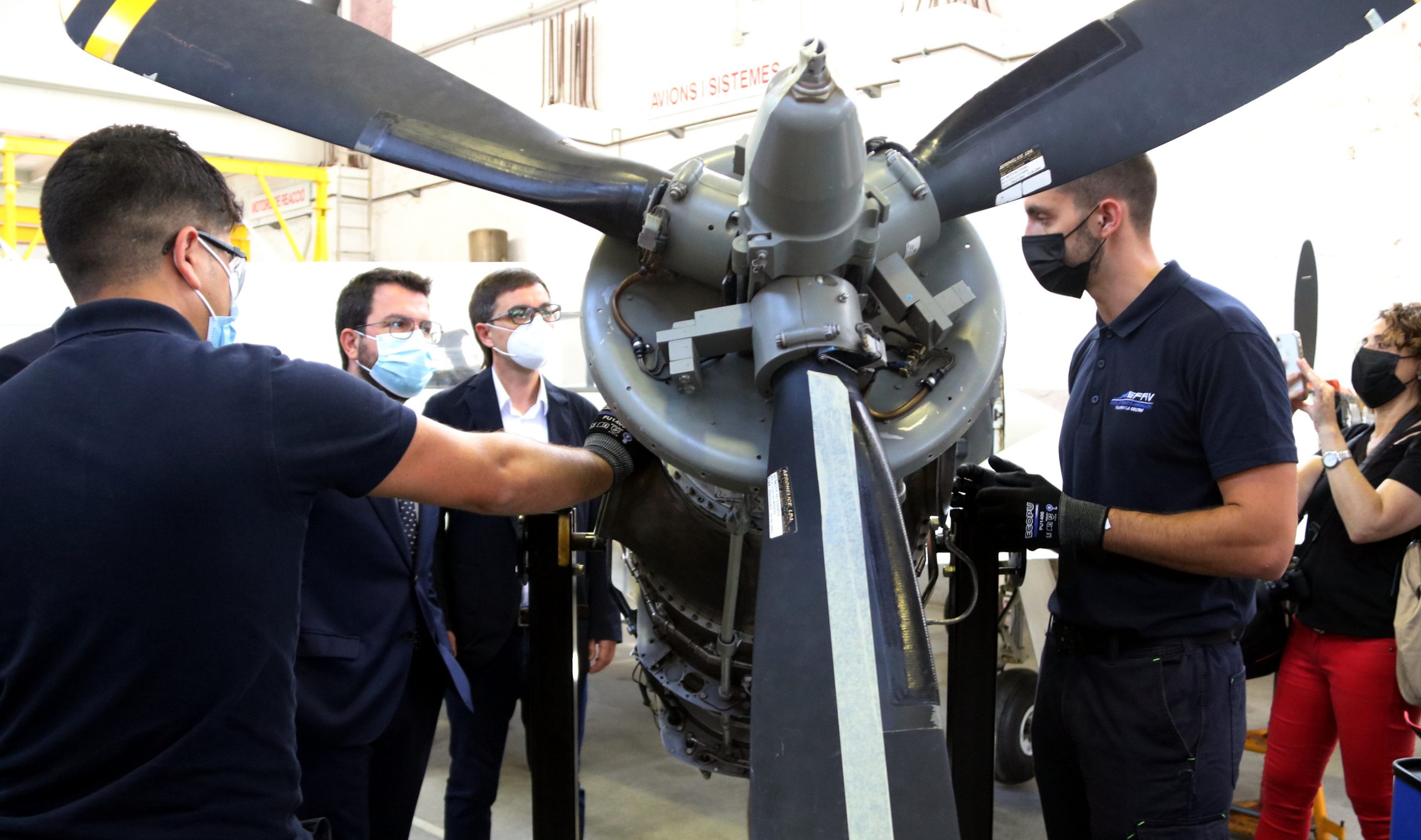Imatge del president de la Generalitat escoltant les explicacions d'un alumne de l’Escola de Formació Aeronàutica l'1 de juliol de 2021