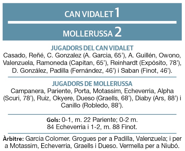 El Mollerussa es va reivindicar ahir amb una fenomenal victòria a domicili al camp del Can Vidalet (1-2). Amb aquest resultat, l’equip de la capital del Pla d’Urgell suma 30 punts i posa tres de distància per sobre de les posicions de descens.