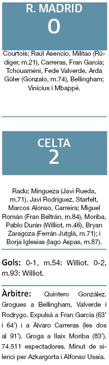 Lluny va quedar l’eficàcia del Madrid quatre dies enrere en San Mamés, on el 0-3 va trencar la ratxa de tres partits consecutius en Lliga que van acabar en empat. Els de Xabi Alonso tornaven al Santiago Bernabéu i van caure derrotats contra el Celta de Vigo en un partit en el qual es van quedar amb nou jugadors –expulsats Fran García i Álvaro Carreras– i sense marcar. La derrota arriba just abans d’iniciar-se una setmana de Champions en la qual els madridistes rebran el Manchester City de Pep Guardiola dimecres. El Madrid es posa quatre punts per sota del Barça, que rebrà l’Eintracht de Frankfurt demà. Militao es va lesionar. El resultat deixa tocat el tècnic, Xabi Alonso, que va valorar que “tots estem enfadats. La lesió de Militao ens ha fet mal. S’ha de girar full. Queda molta lliga i ve la Champions”.