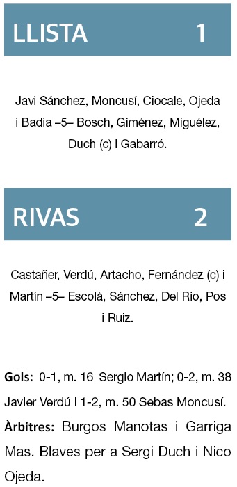 El Llista tenia vint-i-cinc minuts al davant per a remuntar i aspirar a la setena plaça. L’equip lleidatà va aconseguir dominar en els primers minuts de la represa i enfonsar el rivas, però va mancar l’encert en la definició, en part també per culpa del gran partit de Castañer en la porteria rival. El Rivas va neutralitzar el domini i en una jugada personal de Verdú va fer el 0-2 en el 38’. L’1-2 de Moncusí en el 50’ ja va arribar tard.