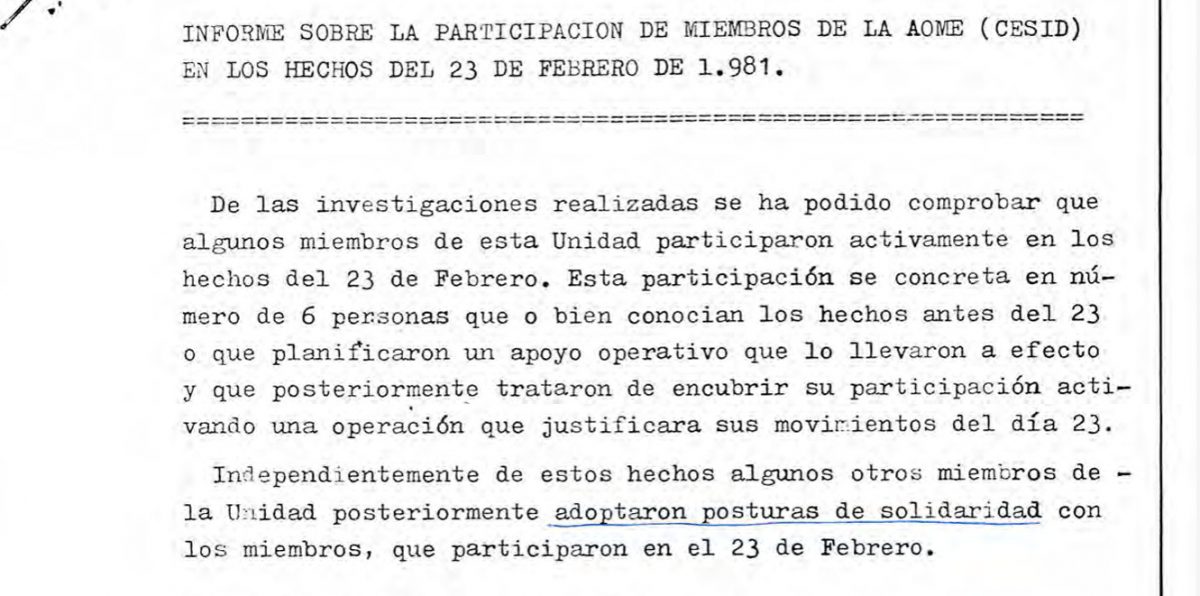 En concret, el CESID recull la seva constància que abans del 23-F ja tenien coneixement de l’operació els capitans Francisco García Almenta i Vicente Gómez Iglesias, així com el sergent Miguel Sales Maroto i el caporal Rafael Monge Segura. Apunta a sospites sobre un altre comandant que podria tenir coneixement previ dels fets, José Cortina, però conclou que no es pot provar.