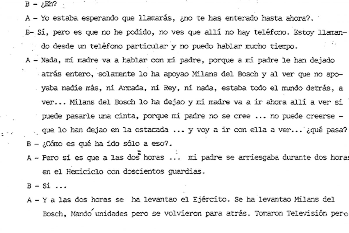 En una d’aquestes trucades desclassificades, la filla d’Antonio Tejero lamenta que al seu pare “l’han deixat enrere” i que només li ha donat suport Jaime Milans del Bosch. “Ni Armada, ni el Rei, ni res, estava tothom al darrere”, relata al seu interlocutor. Elvira Tejero també assegura en un altre fragment: “Estava el Rei al darrere. Ell… estava al darrere, i tot l’exèrcit, tot. Les cinc capitanies d’Espanya. Tothom estava al darrere”.