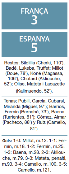 La selecció espanyola de futbol va trencar ahir una maledicció de 28 anys sense que Espanya guanyés un or en un esport per equips en els Jocs Olímpics, en derrotar a França per 5-3 després de la pròrroga en una final de bogeria disputada al Parc dels Prínceps de París.