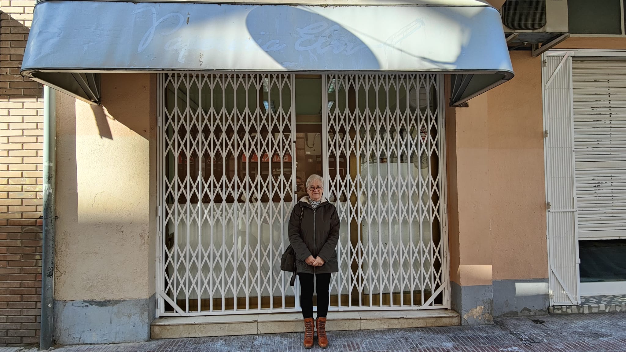 L’Elvi davant les reixes i el tendal on encara s’hi aprecia ‘Papereria Elvi’ / FOTO: À.L.