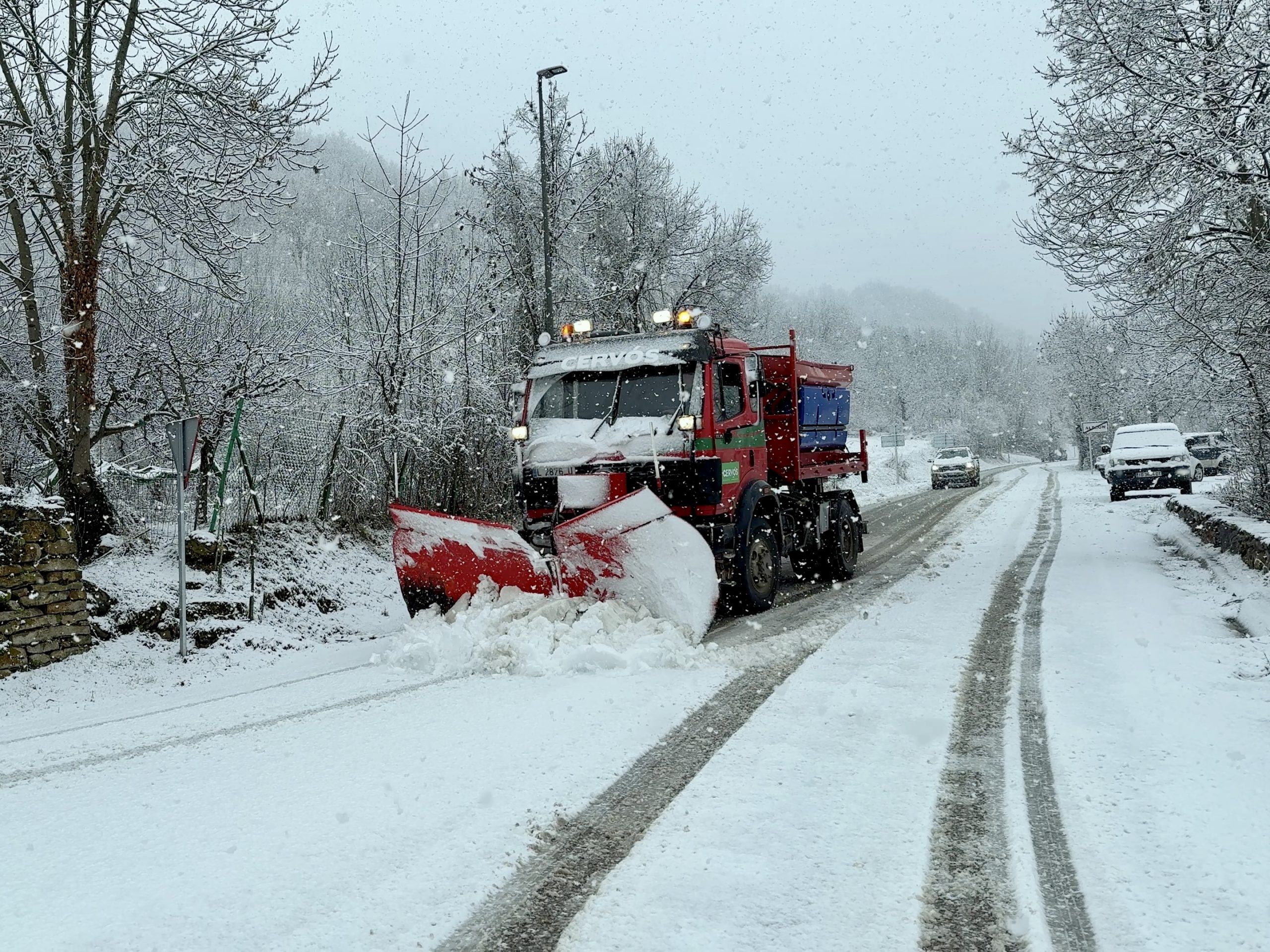 Pas d'una màquina llevaneus per netejar la carretera que va del nucli d'Altron, al municipi de Sort, fins a la capital del Pallars Sobirà i on es veuen diversos vehicles al darrere