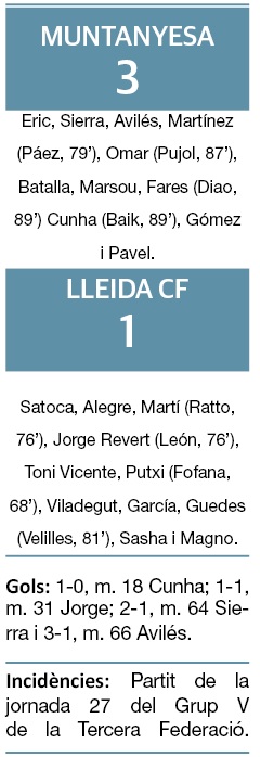 La Muntanyesa, per la seva banda, aspira a classificar-se per al play-off d’ascens a Segona Federació i per això va continuar amb la intensitat ben alta quan Jorge Revert va aconseguir empatar en el minut 32 el gol inicial, de cap, en el 18, del jugador local Francisco Cunha. A la segona part van arribar el 2-1 d’Òscar Sierra (64’) en una jugada plena de rebots i el 3-1 final en una sortida en fals del porter del Lleida Satoca que va convidar a la rematada llunyana i espectacular, des de pràcticament el mig del camp, de Jordi Avilés (66’).