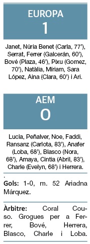 L’Europa va introduir un canvi al descans, però el partit va continuar amb la tònica igualada fins que, al minut 51, la central Ari Márquez, incrustada en posicions d’atac, va sorprendre amb la seva alçada i va rematar de cap una centrada al fons de la porteria (1-0).