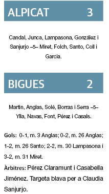 L’encontre va començar malament per al Lleida.net Alpicat. Tot just en el minut tres la jugadora del Bigues Ester Anglas va avançar el seu equip en el marcador. Amb aquest resultat de mínim avantatge per a l’equip visitant es va arribar al descans.