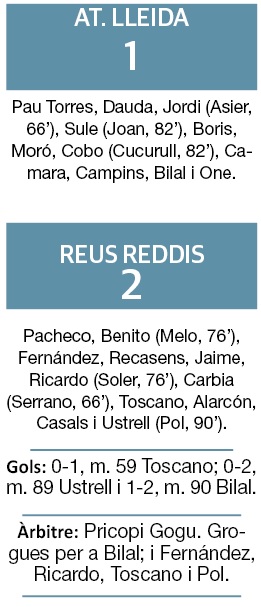 Amb la vuitena derrota a la motxilla. Així se’n va anar a casa l’Atlètic Lleida ahir després de veure’s superat pel Reus Reddis, que ja és segon, en un partit en el qual el conjunt lleidatà va resistir en el primer temps, però que va ser incapaç d’afegir al seu joc, en el segon, el salt de qualitat que necessita. Gabri, que va ser ratificat abans del Nadal, complia partit de sanció i Josep Maria Turull estava a la banqueta. L’equip lleidatà va protagonitzar un bon inici, però a mesura que passaven els minuts el conjunt reusenc s’assentava al camp. En el minut 36 Bilal va gaudir d’una ocasió, i també en el 39. Després d’alguna acció més, el partit va arribar al descans amb 0-0 inicial.