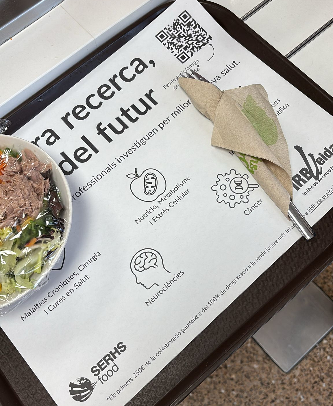 Aquesta iniciativa, finançada gràcies a la Fundación Española para la Ciencia y la Tecnología del Ministeri de Ciència i Innovació, ha permès comptar amb 25.000 estovalles que ja es poden trobar a les cafeteries. El lema “La nostra recerca, la salut del futur” encapçala el disseny de la proposta, on també es poden veure les 5 àrees de recerca de l’IRBLleida i un codi QR per a poder fer-se amic i amiga de l’IRBLleida.