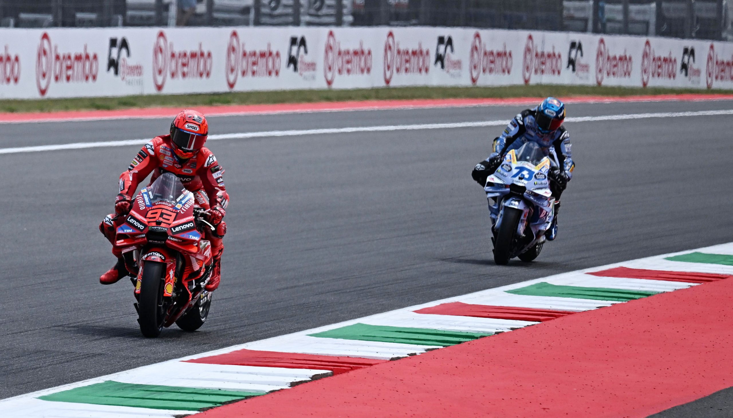 A la primera frenada a la corba de ‘San Donato’ els de Cervera van poder avançar a Bagnaia i l’Àlex es va posicionar com el nou líder, molt seguit pel seu germà. Aquest avantatge va durar fins a la quarta vola, on precisament, de nou a la corba de ‘San Donato’, el primogènit no va deixar escapar l’oportunitat de col·locar-se en la primera posició.
