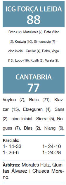 Una més, i ja són vint-i-quatre victòries de l’ICG Força Lleida en una temporada que ja és històrica en la LEB Oro, i que els lleidatans volen sentenciar amb un ascens somiat a l’ACB quan queden només 2 jornades, ahir amb càntics de “Volem ACB” d’un Barris que va empènyer a l’equip a una nova remuntada davant Cantàbria. L’equip lleidatà, encara sense Hasbrouck, va guanyar un partit que perdia 14-33 al final del primer quart i que va acabar guanyant per 11 punts (88-77).