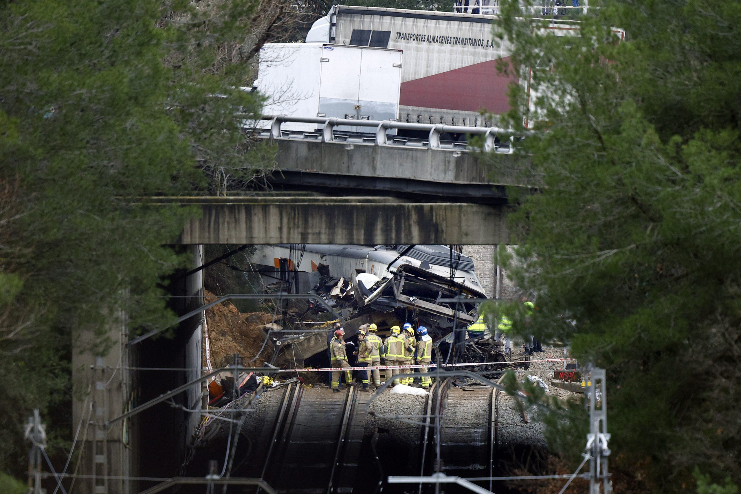 FOTO_ Quique Garcia (EFE) Imatge del tren de Rodalies accidentat a Gelida, amb l’afectació del mur de càrrega, i el pont per on passa l’autopista que ha hagut de ser tallat pel risc d’esfondrament