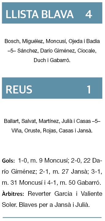 Els d’Edu Amat van estar especialment seriosos en defensa i, quan els del Baix Camp finalitzaven les seves jugades, sota pals sempre hi havia un segur Xavi Bosch, que va ser clau. Moncusí (2), Darío i Gabarró van golejar.