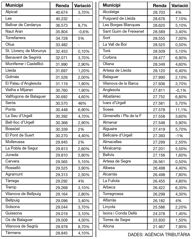 Només Alpicat, Les i Bellver de Cerdanya tenen una renda bruta mitjana per sobre de la mitjana catalana, que és de 35.925 euros, i aquests tres municipis més Naut Aran, Torrefarrera, Olius, Sant Llorenç de Morunys, Benavent de Segrià, Montferrer i Castellbò, Lleida i Golmés estan per sobre de la mitjana espanyola, que és de 31.333 euros.