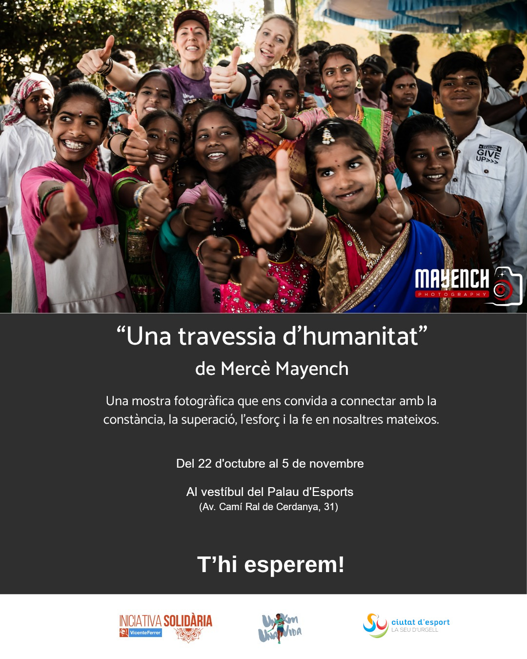 A partir d’avui dimecres 22 d’octubre i fins el 5 de novembre es pot visitar de manera lliure al Palau Municipal d’Esports de la Seu d’Urgell la mostra fotogràfica ‘Una travessia d’Humanitat’, de Mercè Manyech, que reflexa els valors humans i solidaris que inspiren la Travessa Solidària Transfronterera 1Km1Vida.
