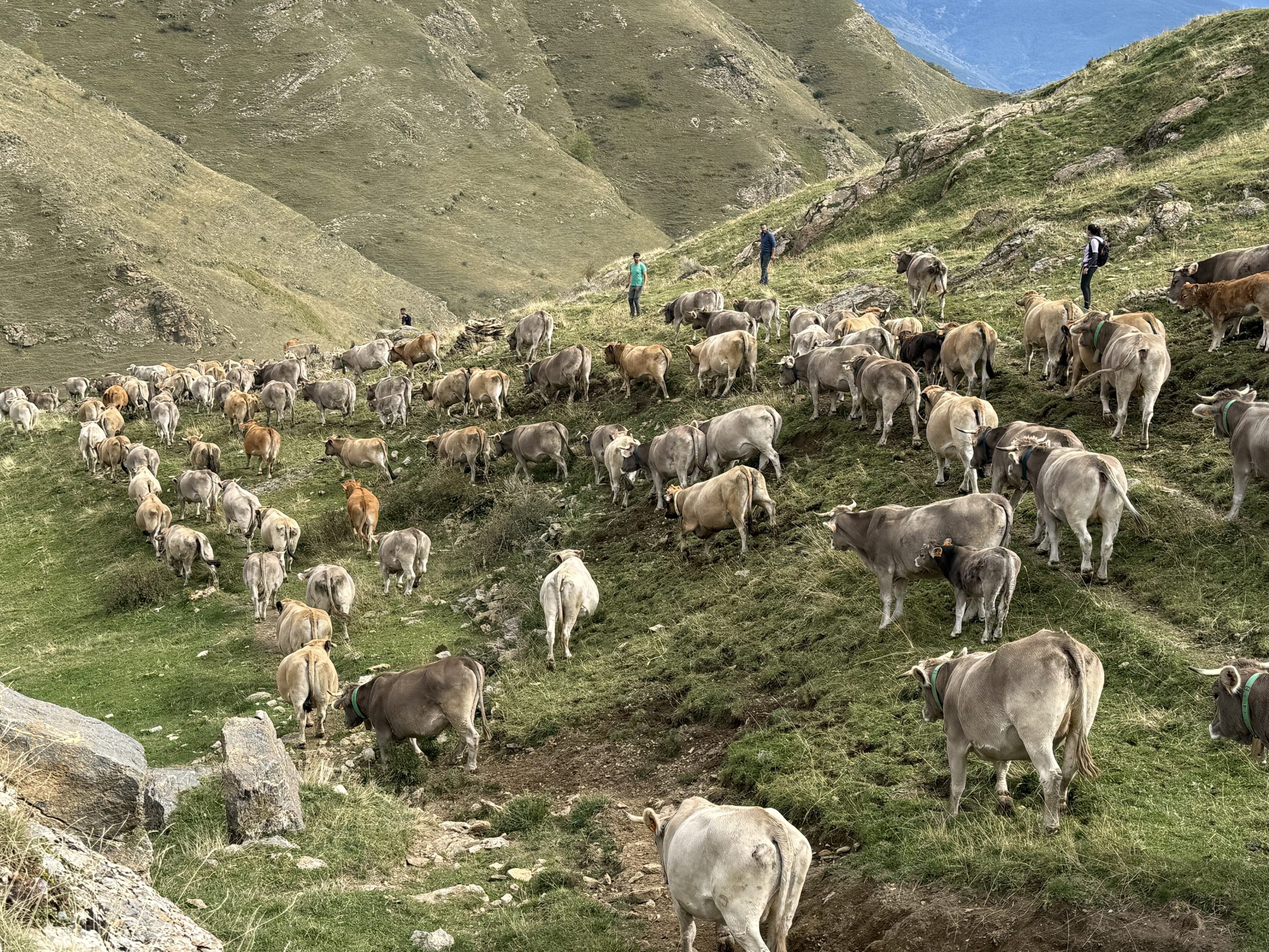 Les bones temperatures i la quantitat d’herba que encara hi ha a la muntanya va fer que els animals es resistissin a baixar i els costes una mica més que altres anys reunir les més de 1.200 vaques en un punt. Des d’aquest punt, a mitja muntanya, totes juntes les condueixen fins al pàrquing de Llessui on cada propietari les carrega als camions.