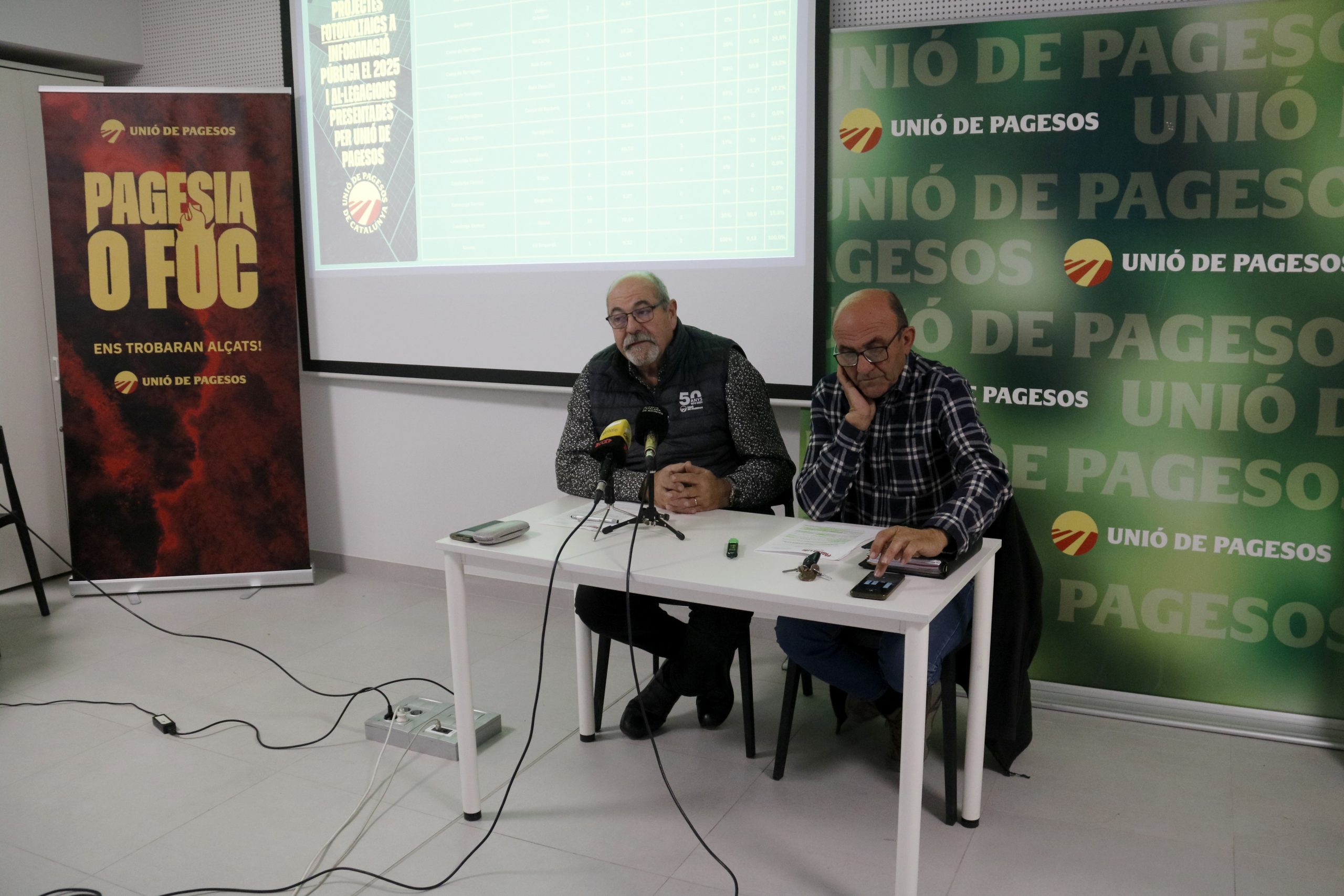 Unió de Pagesos va presentar al·legacions a 43 projectes d’energies renovables el 2025, dels quals 38 corresponen a parcs solars i 5 a parcs eòlics, que en conjunt ocuparien prop de 500 hectàrees de terreny, majoritàriament agrícola. El sindicat agrari va assegurar que està a favor de les energies renovables, però va alertar que el seu desplegament no pot fer-se “a costa de perdre terres agrícoles ni d’expulsar pagesos del territori”. Per aquest motiu, l’organització defensa que els parcs fotovoltaics haurien de ser molt més petits, preferentment per sota de les 10 hectàrees, situar-se en terrenys de baixa productivitat agrària i que impliquin de manera directa el territori. En cas que s’ocupin terres productives, el sindicat exigeix l’aplicació de la Llei d’Espais Agraris, una normativa que obliga a compensar la pèrdua de producció mitjançant la millora de les finques veïnes. “Hi ha una llei que precisa que si en unes terres de secà es posen plaques, la finca adjacent s’ha de millorar perquè el que es deixa de produir en una zona es guanyi en l’altra”, va afirmar el coordinador de la comissió especialitzada d’energies renovables d’Unió de Pagesos, Jaume Pedrós.
